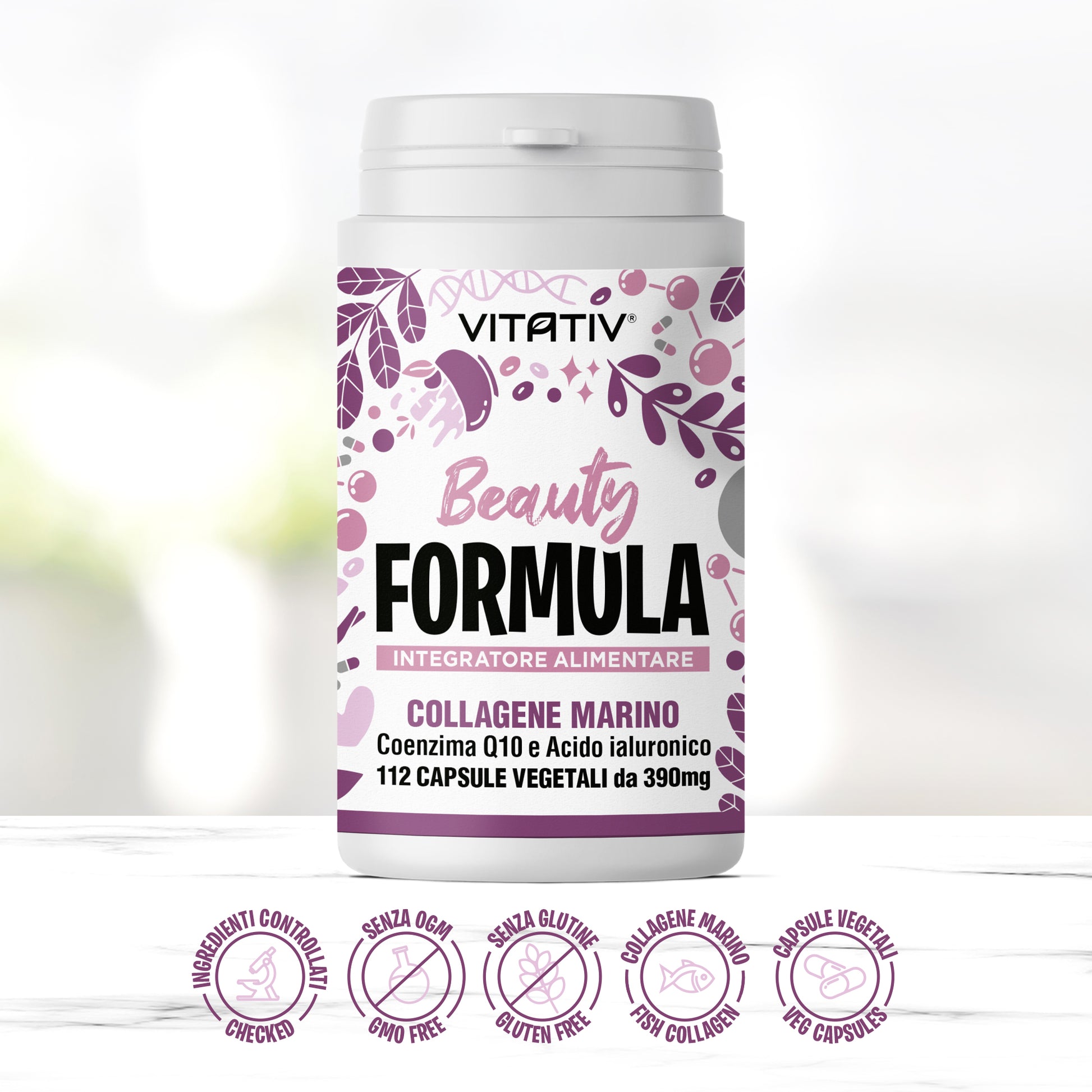 Beauty Formula Vitativ è un integratore alimentare a base di collagene marino, coenzima Q10 e acido ialuronico, sviluppato per l’integrazione quotidiana all’interno di uno stile di vita sano ed equilibrato.