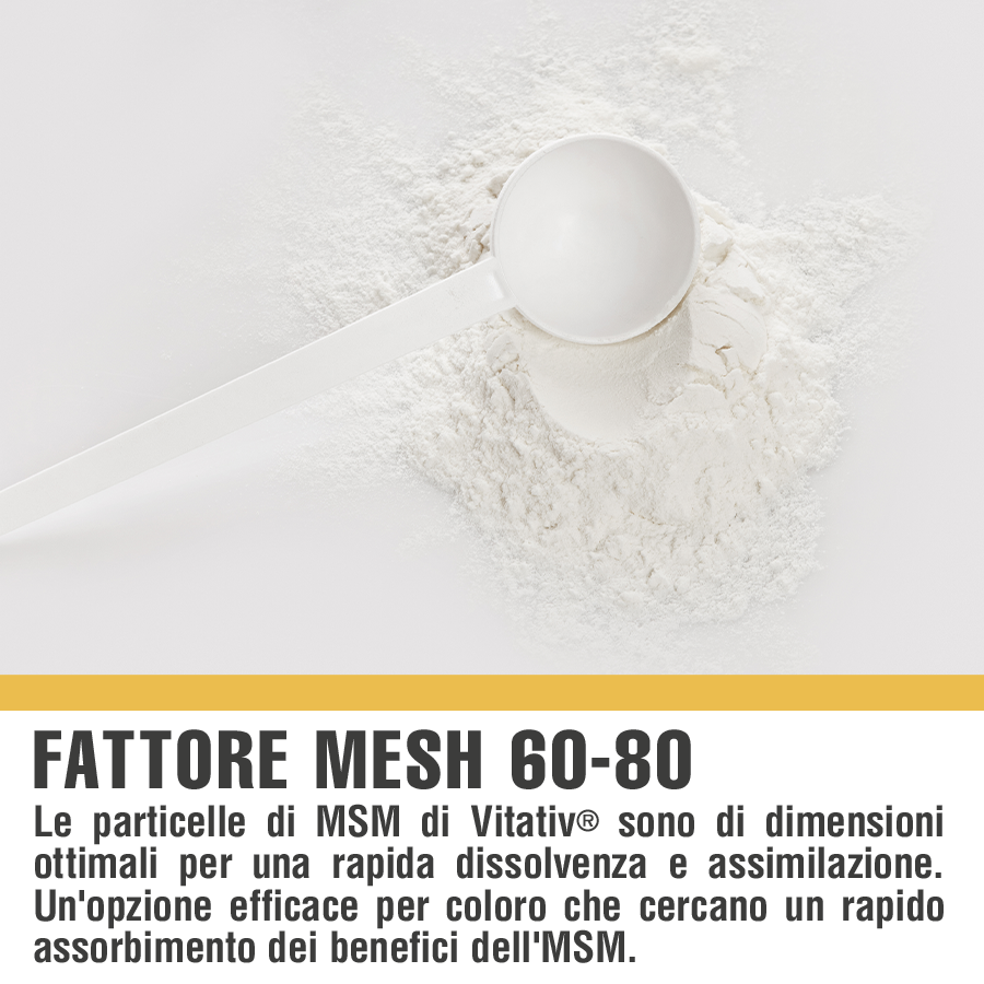 Metil sulfonil metano di Vitativ ha un grado di Purezza pari al 99,9% e un Fattore Mesh di 60-80. il che significa che MSM di Vitativ è facilmente solubile in acqua e assimilabile e digeribile. L'MSM di Vitativ è PURO e formulato senza l'aggiunta di additivi, zuccheri, calorie, OGM e conservanti. Questo lo rende un'opzione naturale e priva di ingredienti indesiderati. L'assenza di tali componenti garantisce una maggiore purezza e riduce il rischio di effetti collaterali o reazioni avverse. Disponibile nel formato da 500g, confezionato in buste doypack con zip richiudibile per una migliore conservazione.
